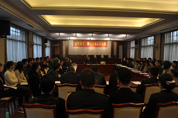 会议中长江房产常务副总缪秦宣读《廉洁协议》及《廉洁处罚条例》,宣读完毕后,所有与会人员签订了此协议;廉正廉洁办公室主任讲述整风肃纪、廉洁自律有关问题,提出了很多在我们身边发生的不遵守公司规章的现象,发人深省;最后宣读《员工考勤制度》及《考勤实施细则》,并公示。
